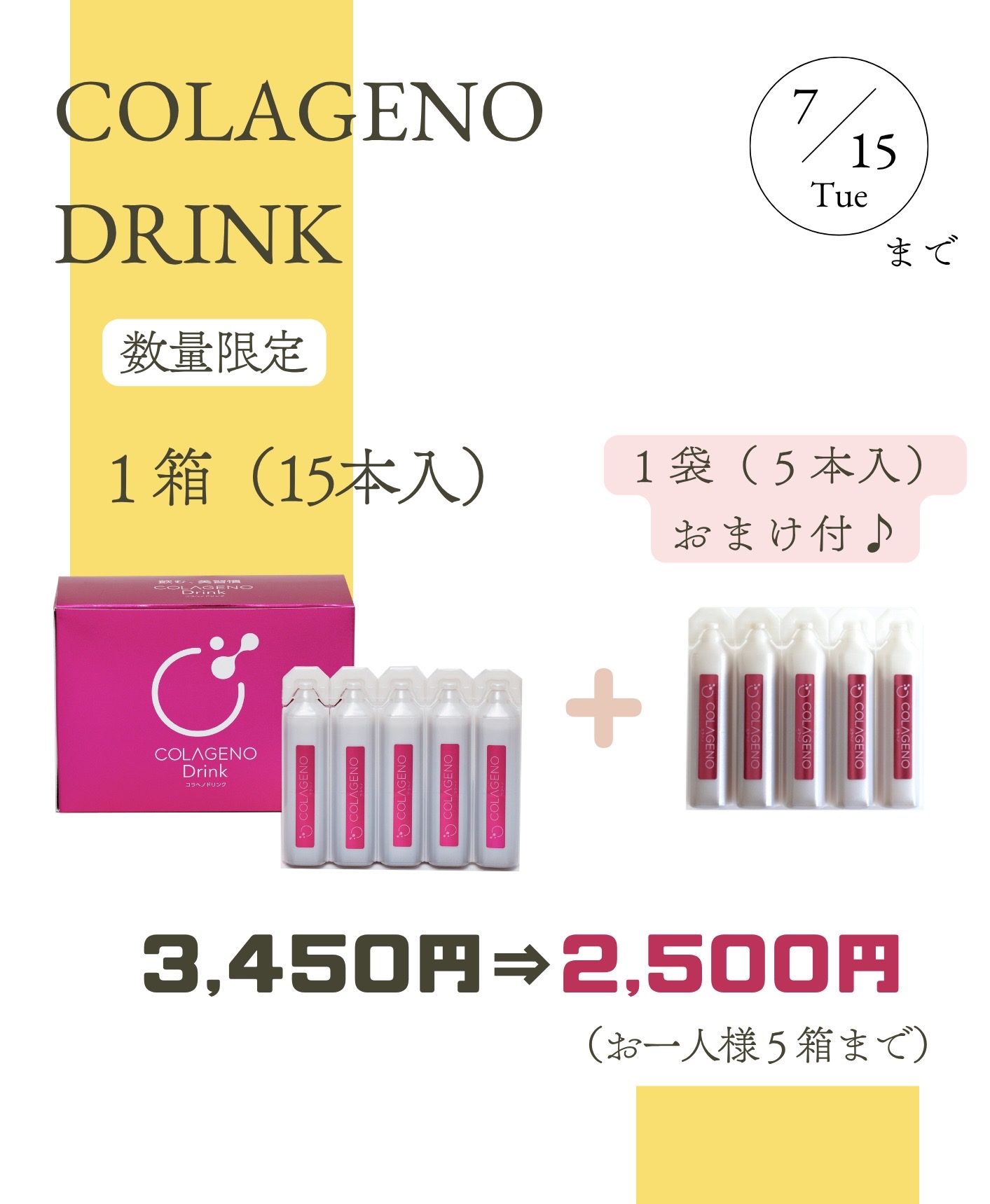 ☆コラヘノドリンク 1箱(15本入り) 3,450円 ⇒ 2,500円(税込) 1パック5本入のおまけ付