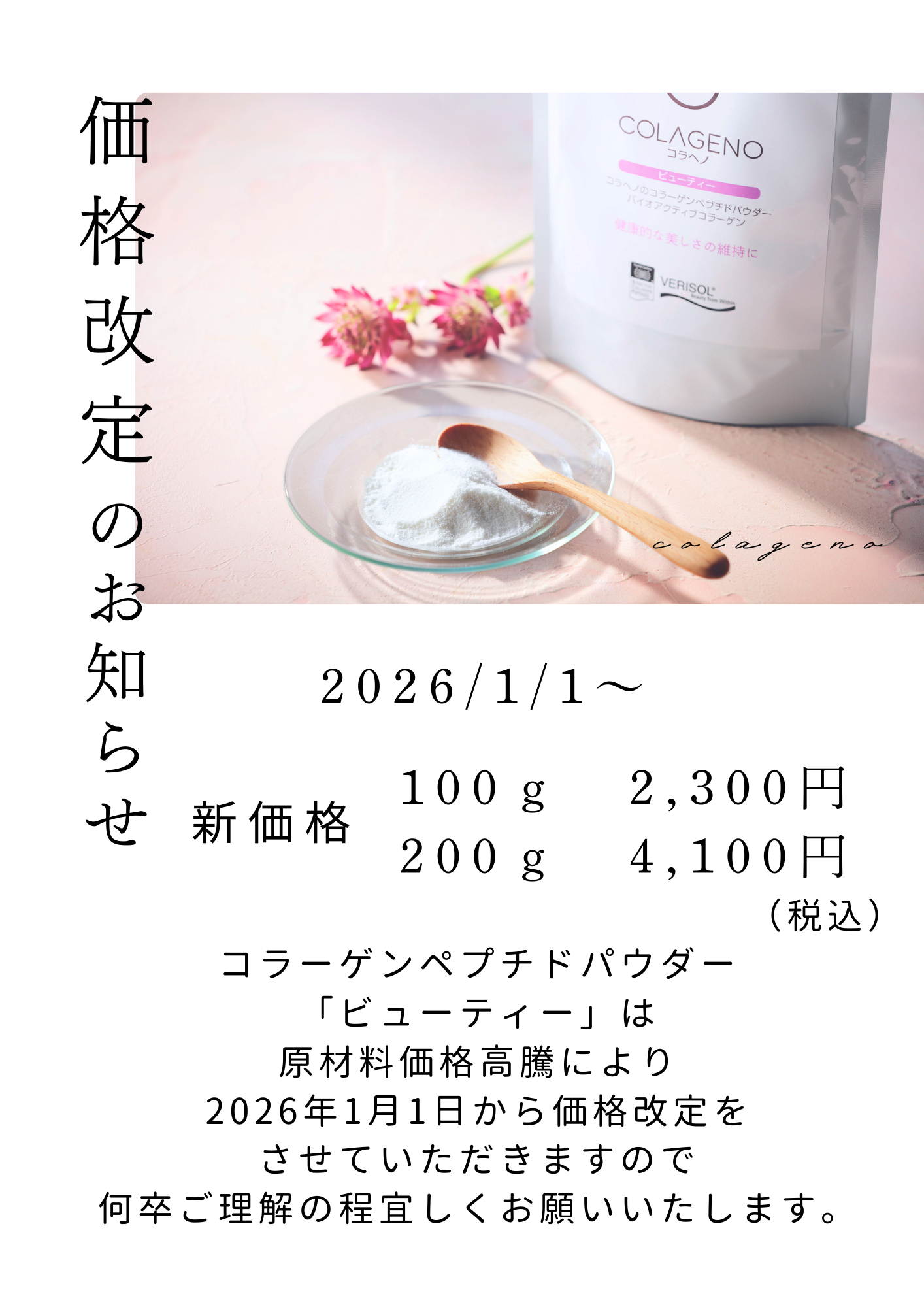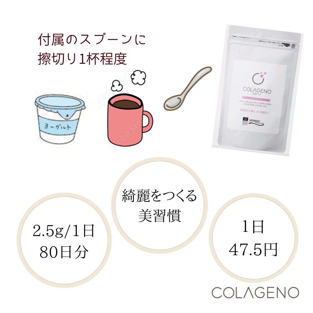 コラーゲンペプチドの粉末タイプ。美と健康の維持に役立つ、ドイツGELITA社製の「ベリゾール」を原料としています。牛由来のコラーゲンペプチドが原料となっており、粒子が細かく溶けやすいので、様々な用途にご使用いただけます。特に乳製品との相性が良く、くせや匂いがほとんどないためお飲み物やお料理に加えても手軽に美味しくいただけます。