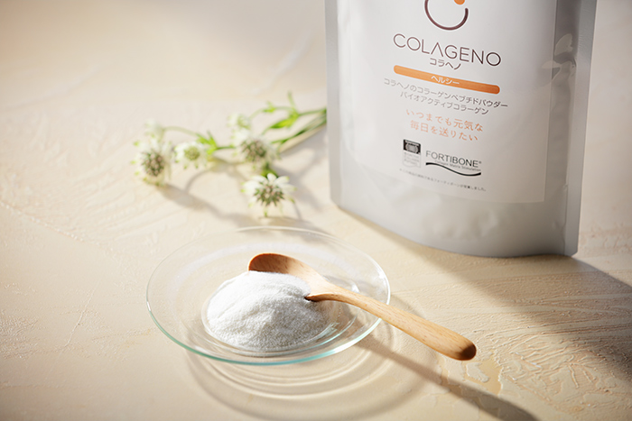 コラーゲンペプチドの粉末タイプ。身体の健康維持に役立つ、ドイツGELITA社製の「フォーティボーン」を原料としています。牛由来のコラーゲンペプチドが原料となっており、粒子が細かく溶けやすいので、様々な用途にご使用いただけます。特に乳製品との相性が良く、くせや匂いがほとんどないためお飲み物やお料理に加えても手軽に美味しくいただけます。